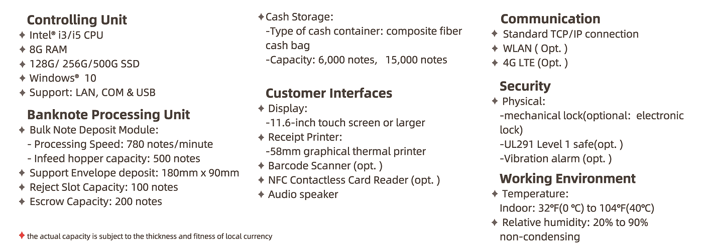 SuperiorPerformance: High banknotes processing speed (up to 780 notes/minute) with large infeed hopper considerably reduce deposit time for users. Optimized mechanical design and algorithm ensure ultra-low jam rate for smoother user experience.